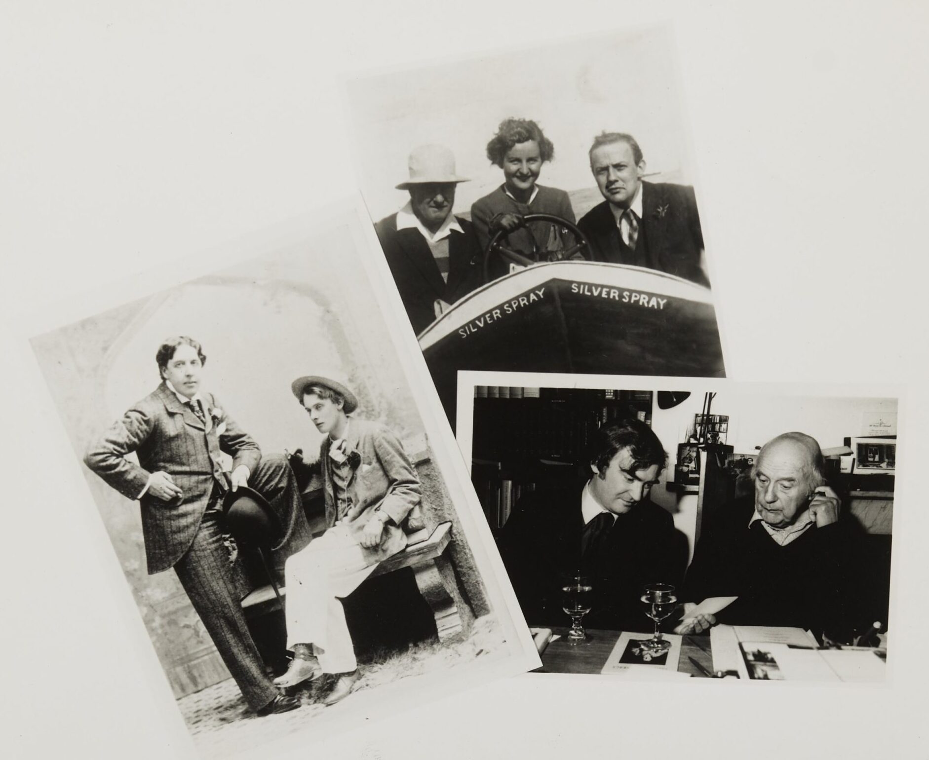 The left-hand image from 1893 shows Magdalen men Oscar Wilde and his lover, the poet Lord Alfred Douglas. The central image shows Betjeman, Douglas, and Nancy Mitford in 1930. Betjeman and Hillier, another Magdalen alumnus, are seen in the right-hand photograph from 1982 (by Tara Heinemann).