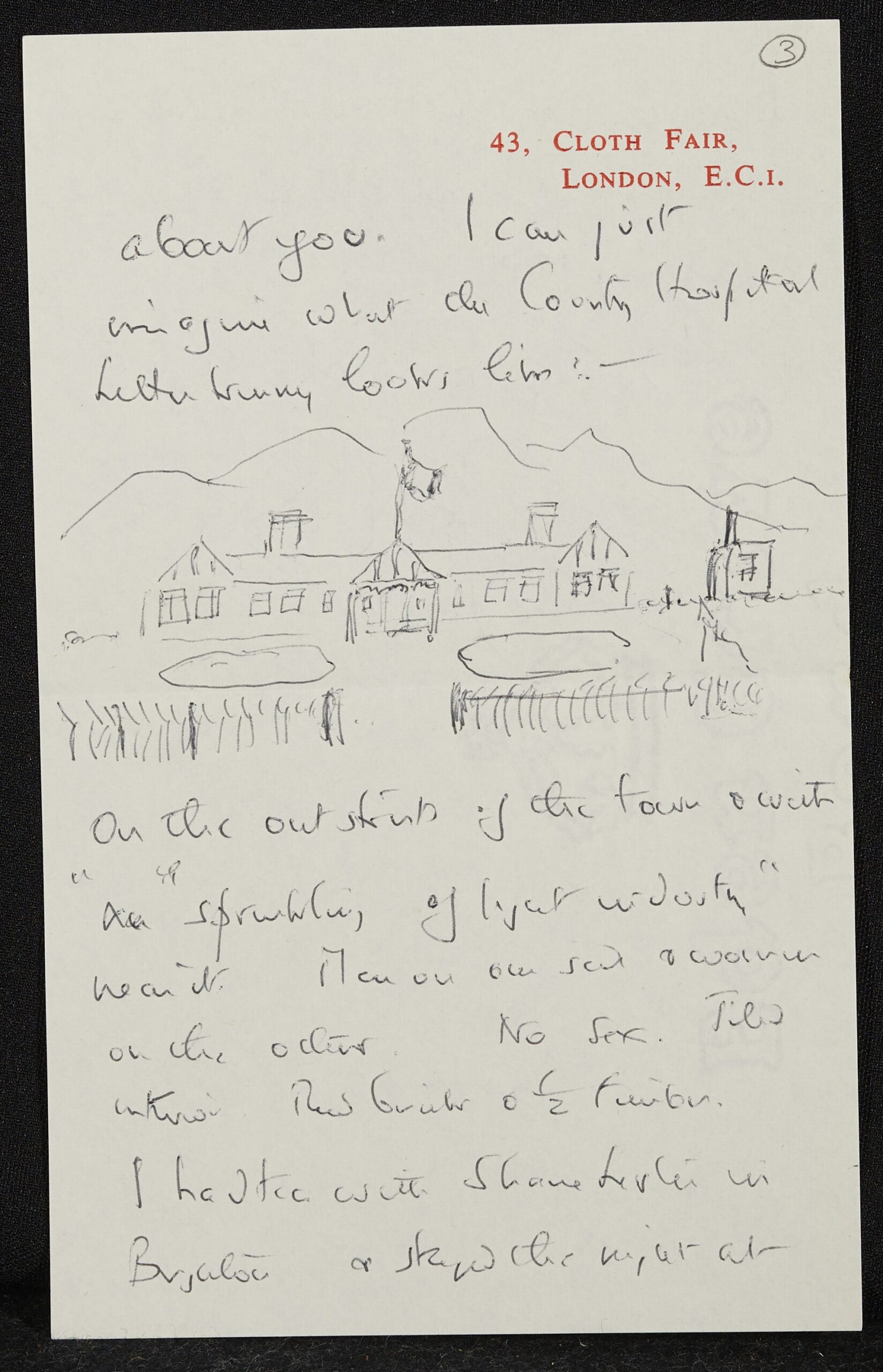 In this letter to his old Magdalen friend Lionel Perry, Betjeman discusses Perry’s health and sketches what he imagines Letterkenny Hospital to look like. (Perry’s most recent letter to him was written from there.)