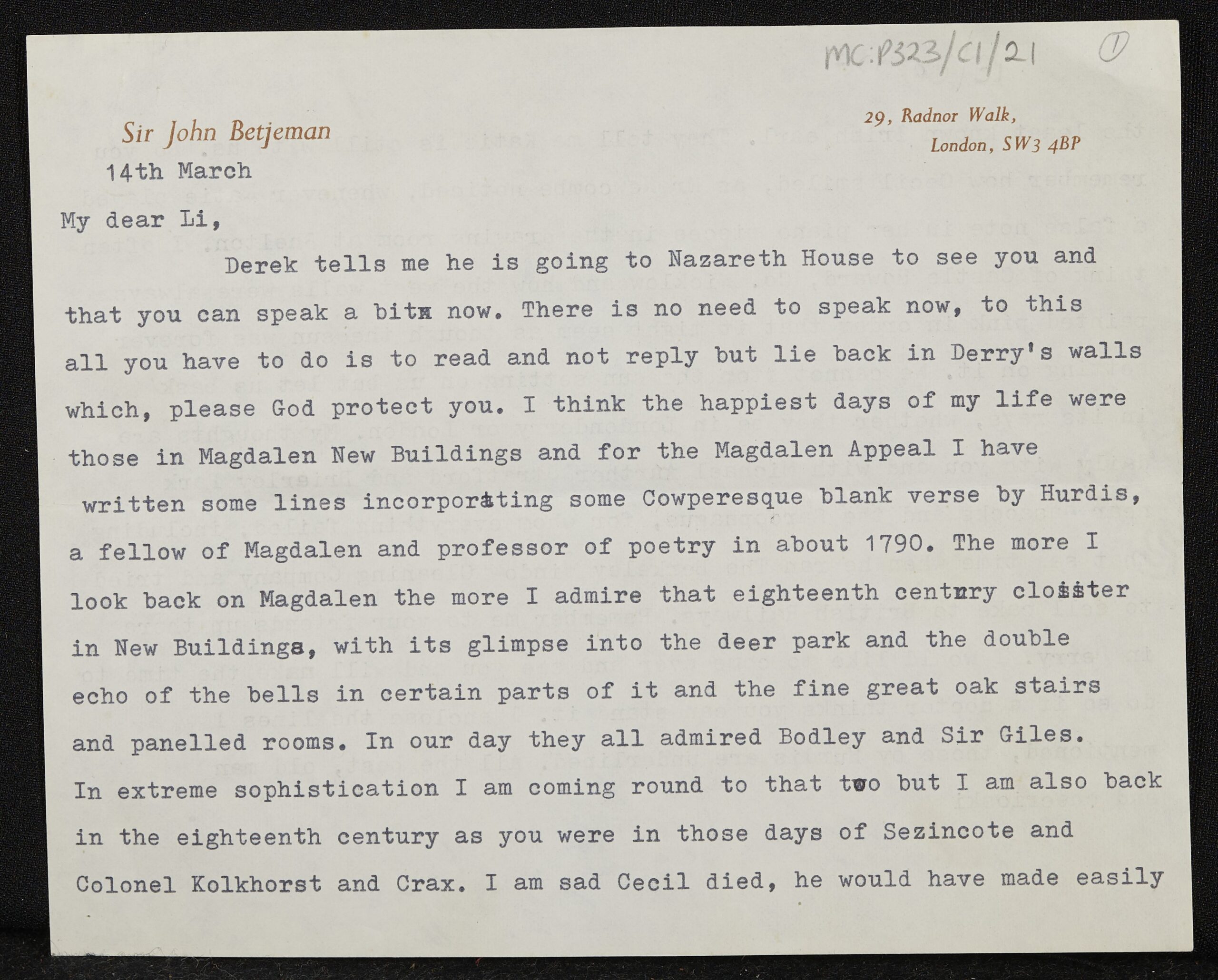 Betjeman wrote this letter to his friend Lionel Perry in 1980, the year of Perry’s death. It begins with a reference to Perry’s declining health and goes on to reflect on Betjeman’s time at Magdalen, where he and Perry were students together (“the happiest days of my life”).