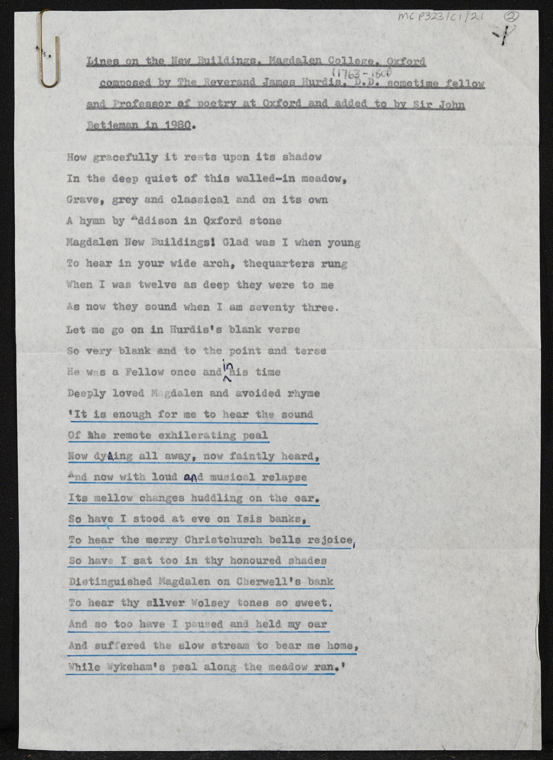 Enclosed is a poem by James Hurdis, an 18th-century fellow of Magdalen. Betjeman has added some lines of his own composition (line 9 onwards) about the bells of Oxford.