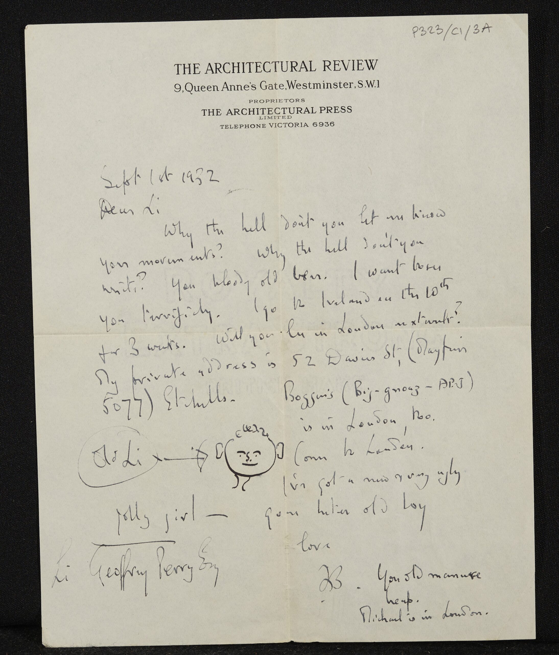 Betjeman has drawn a sketch of Perry in this letter, with the affectionate caption ‘Old Li’.