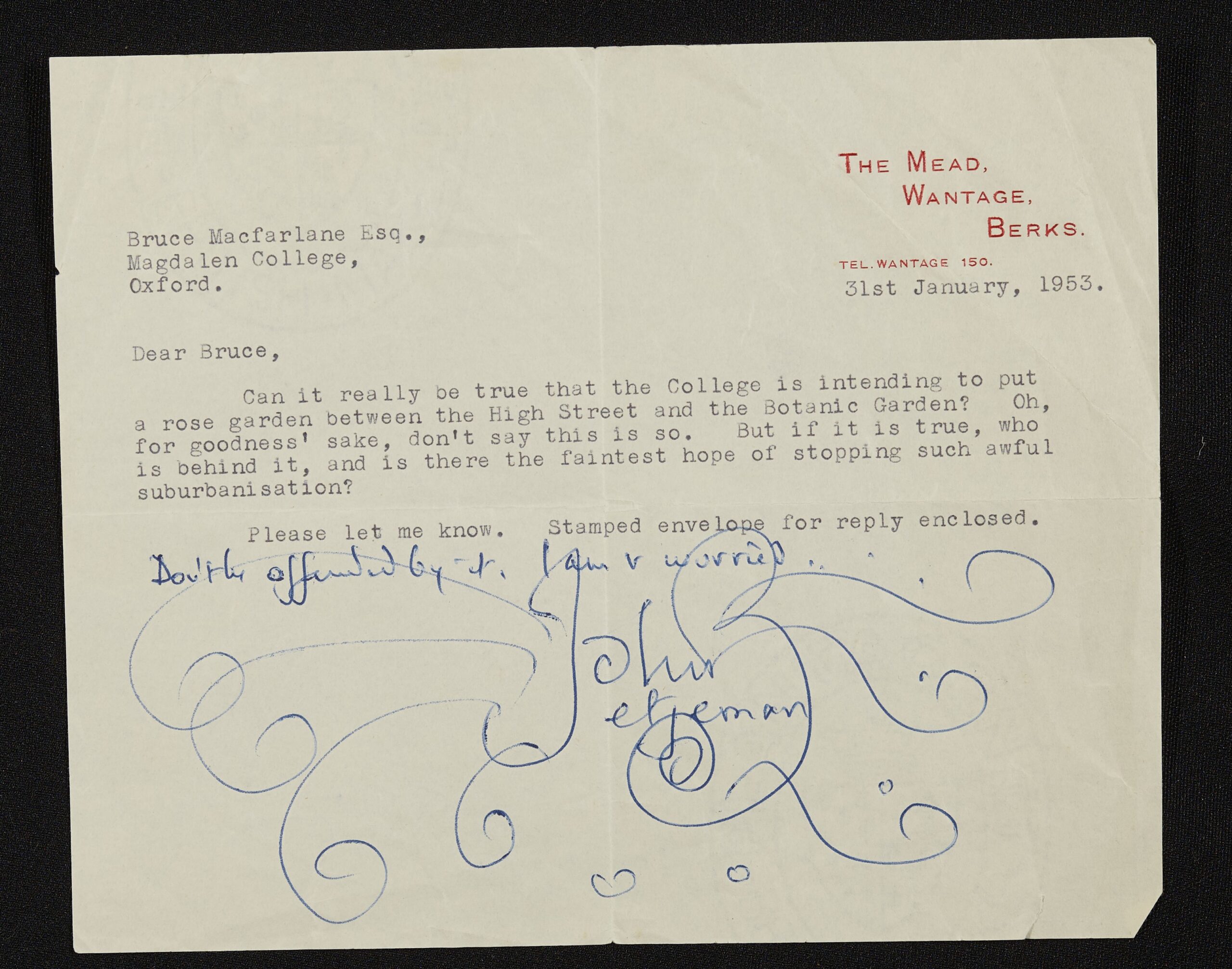 Betjeman expresses his strong opposition to plans to plant a rose garden between the Oxford Botanic Gardens and High Street (‘awful suburbanisation’). The Lasker Rose Garden, planted despite Betjeman’s objections, endures to this day.