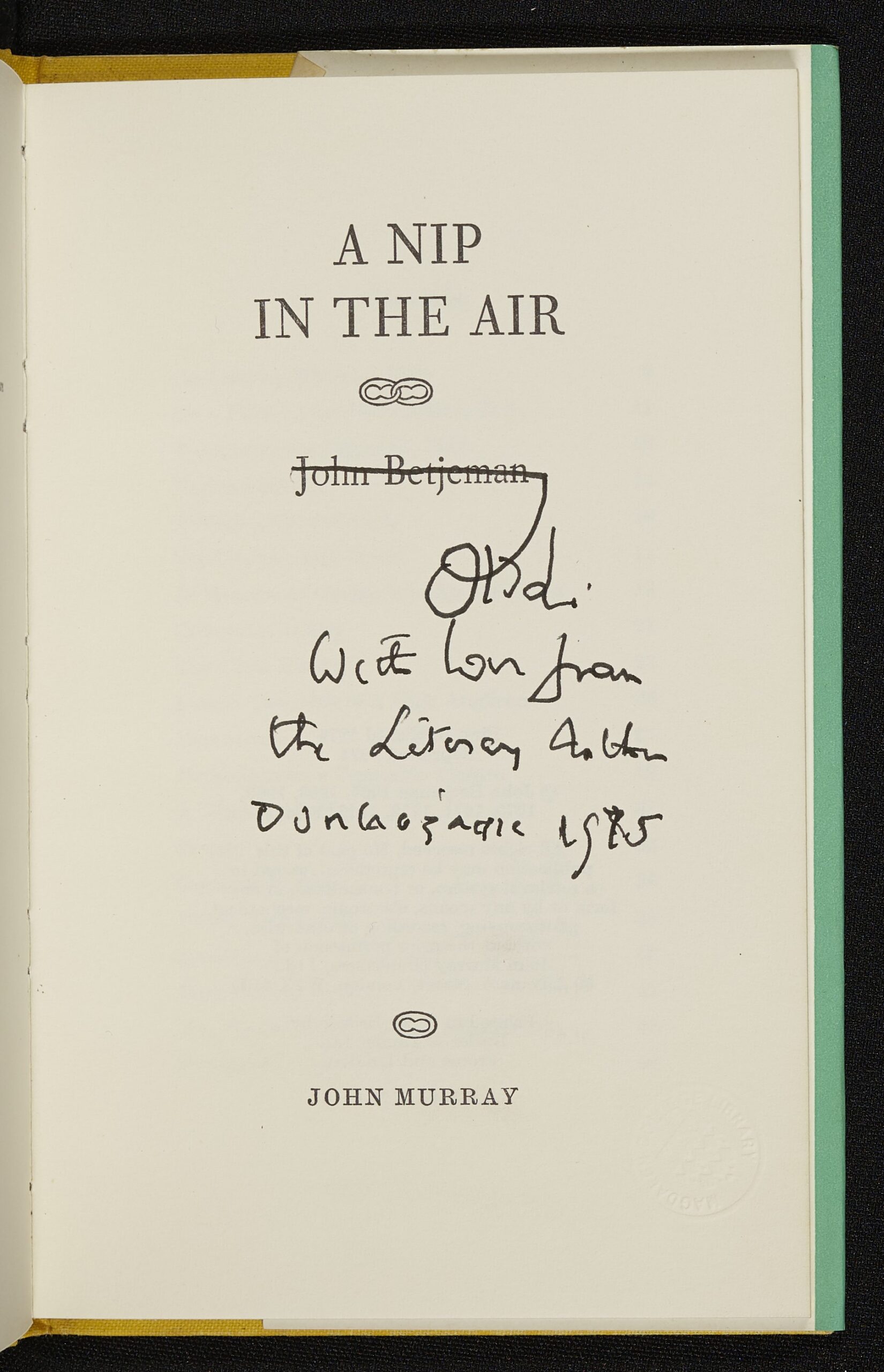 Betjeman’s warmth and self-deprecating humour come through in this tongue-in-cheek inscription to Lionel Perry: ‘With love from the Literary Author’.