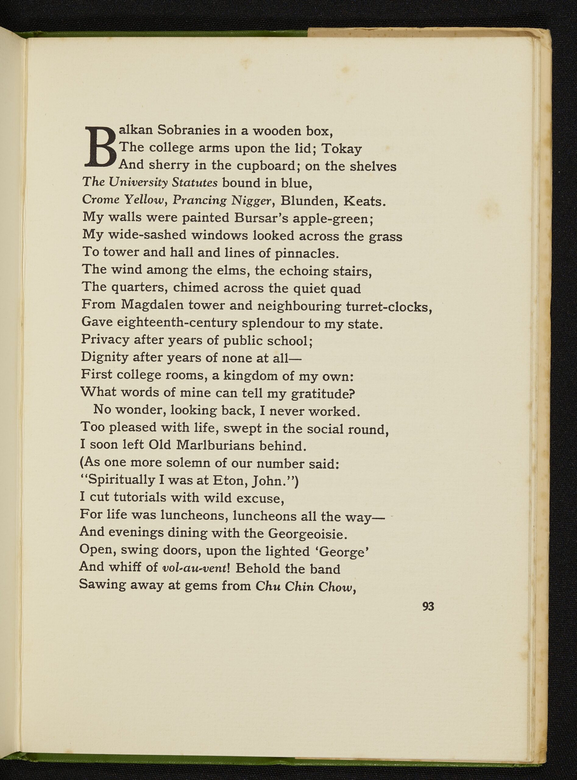This autobiography-in-verse describes Betjeman’s childhood and adolescence in a humorous style. Life at Magdalen is portrayed as ‘luncheons, luncheons all the way’ for the eighteen-year-old Betjeman, who admits he was so ‘swept in the social round’ that he ‘cut tutorials with wild excuse’.